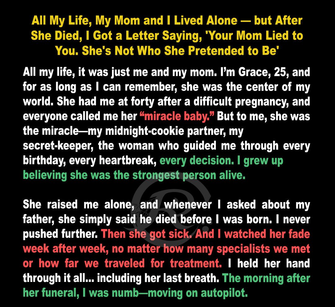 Your mother loved you more than anything. But there’s something you need to know now that she’s gone. She… lied to you, Grace. She’s not who she pretended to be.