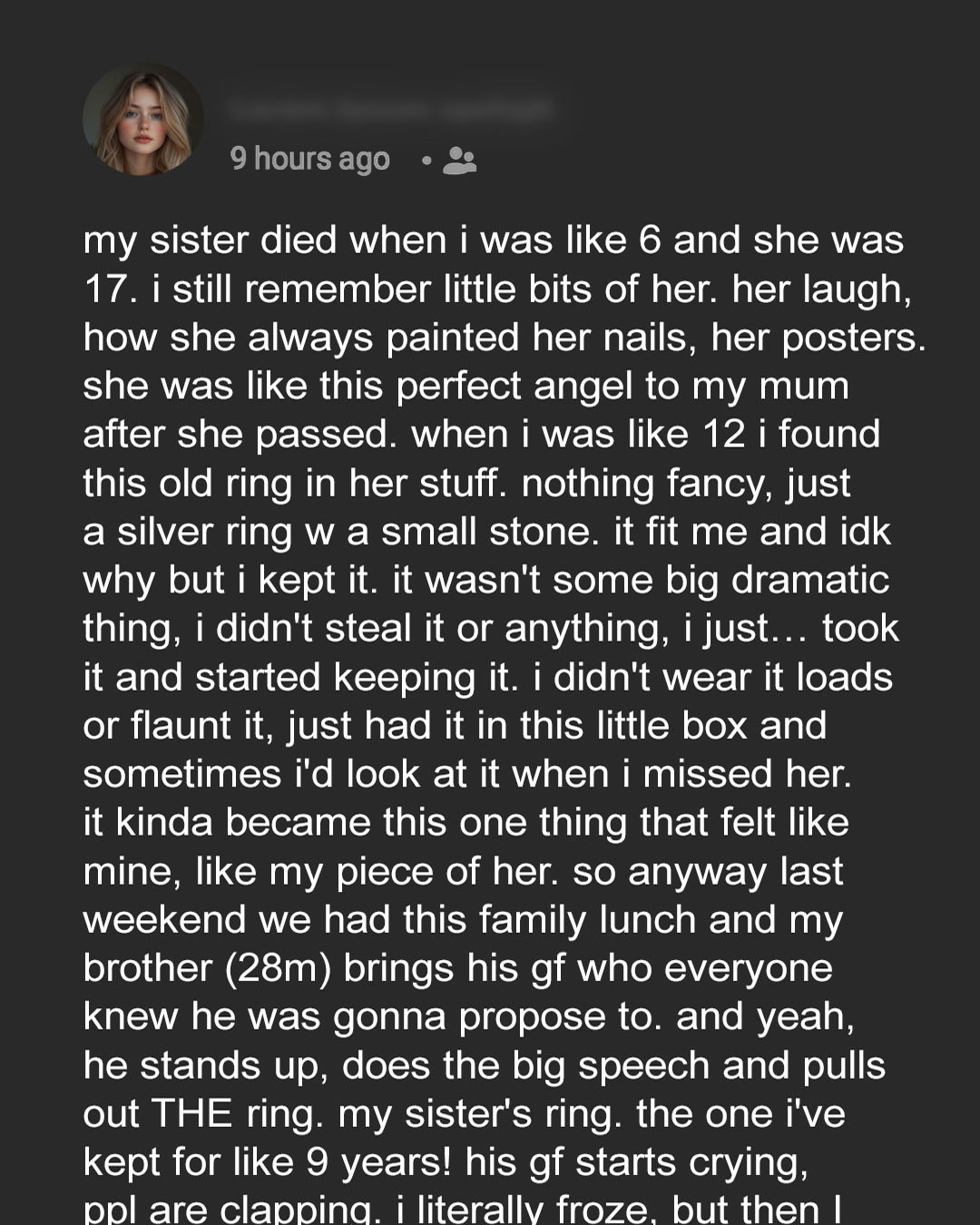 When my sister died, she left behind a ring. I treasured it for nearly a decade… until my brother gave it to his girlfriend without asking me. Am I wrong for wanting back the one thing I had left of my sister?