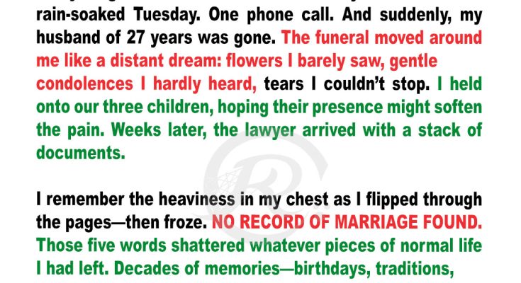 When my husband died after 27 years together, I thought grief was the worst pain I’d ever face. But then his lawyer told me our marriage never legally existed, and I had no claim to anything we’d built. I was about to lose everything, until I discovered the shocking truth about why he’d kept this secret.