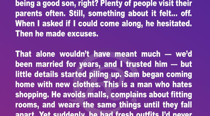 When Margaret hugged him, she smelled a fragrance she hadn’t seen in months suddenly on his neck. She also noticed how Sam now lingered in front of the mirror with a kind of careful calculation that felt foreign to her.