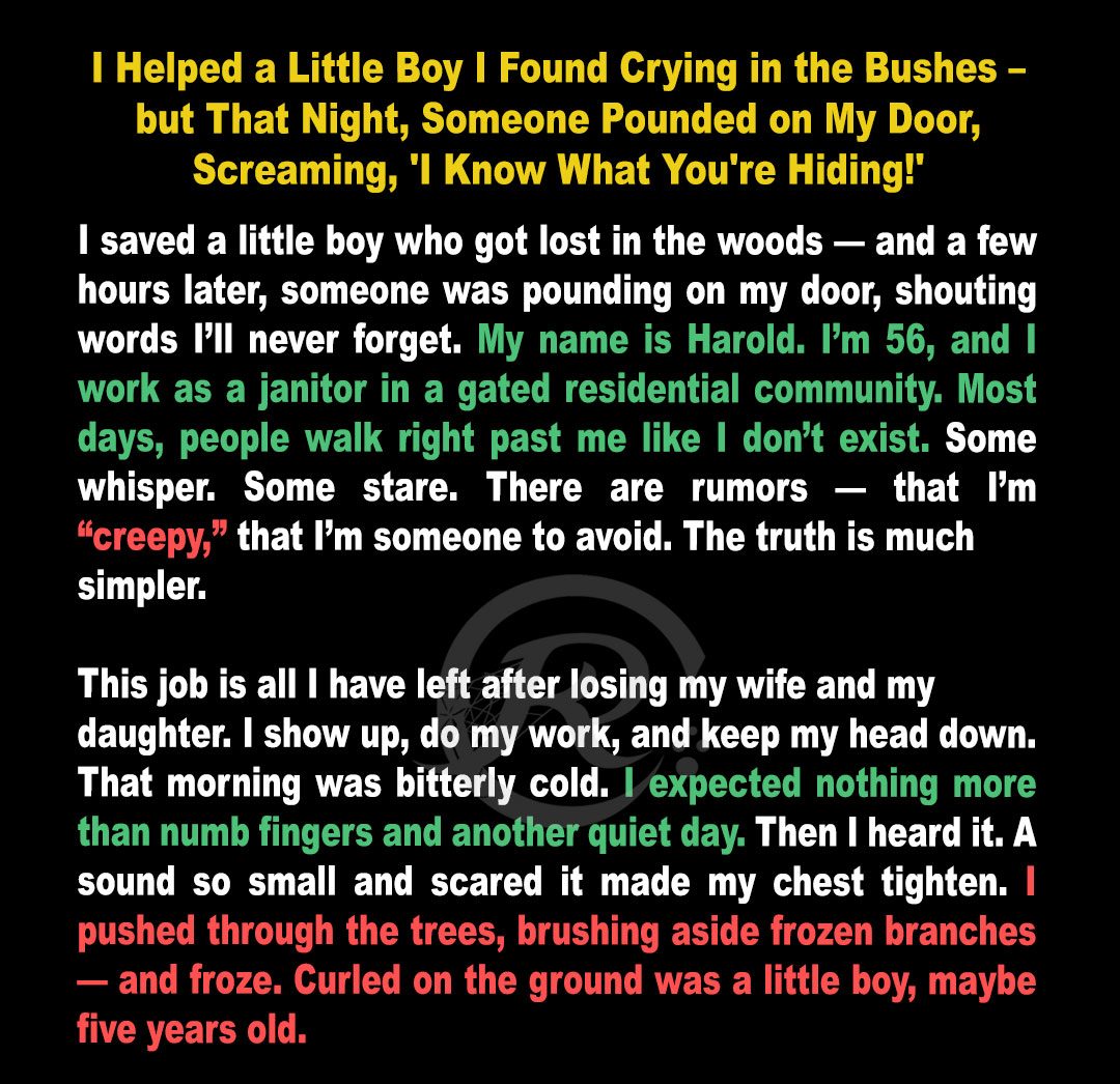 “I found him in the bushes. Cold. Barefoot. Soaked. He wasn’t talking. Just making these tiny sounds.” I took a breath. “I sat down, gave him my jacket, called for help, and waited. That’s it. That’s the whole story.”