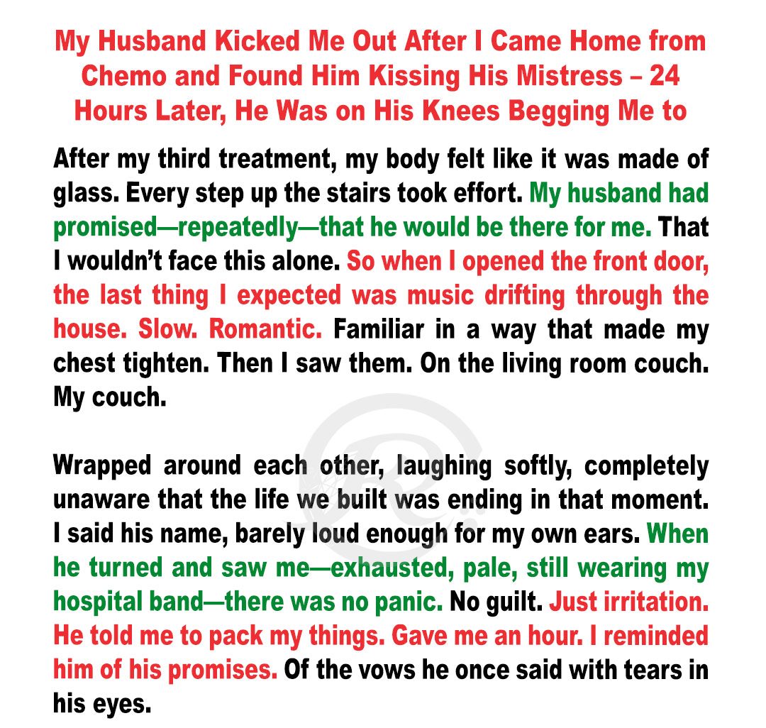 I came home from chemo to find my husband kissing his mistress on our couch. He laughed at me and gave me one hour to leave “with nothing.” But karma had other plans, and within 24 hours, he’d learn what “nothing” really meant.