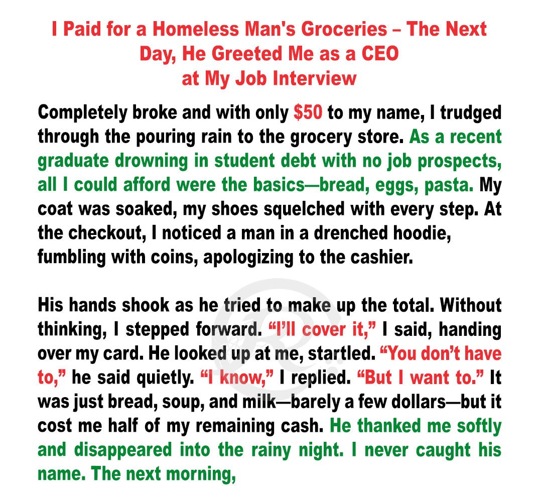 I Paid for a Homeless Man’s Groceries – The Next Day, He Greeted Me as a CEO at My Job Interview