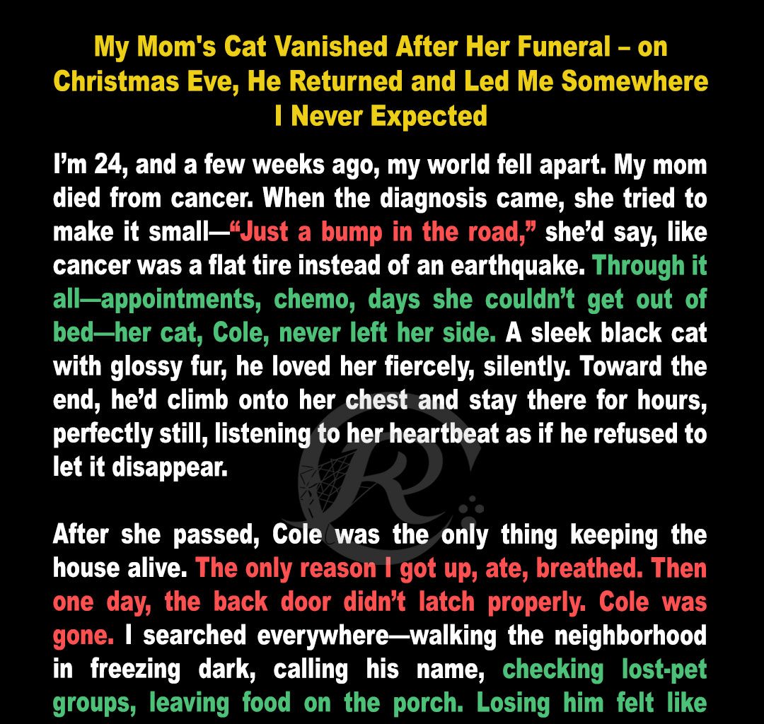 My mom died from cancer a few weeks ago, and her black cat, Cole, was the only thing holding me together. When he disappeared after her funeral, I thought I’d lost the last piece of my mother. On Christmas Eve, Cole came back with something in his mouth, and where he led me next left me in tears.