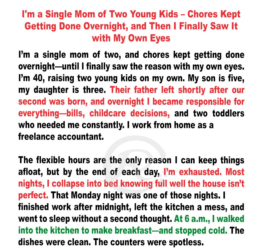 I woke up to find my disaster of a kitchen spotless. Then groceries I didn’t buy appeared in my fridge. I live alone with my kids. No one had a key, and I was losing my mind… until I hid behind the couch at 3 a.m. and saw who’d been sneaking in.