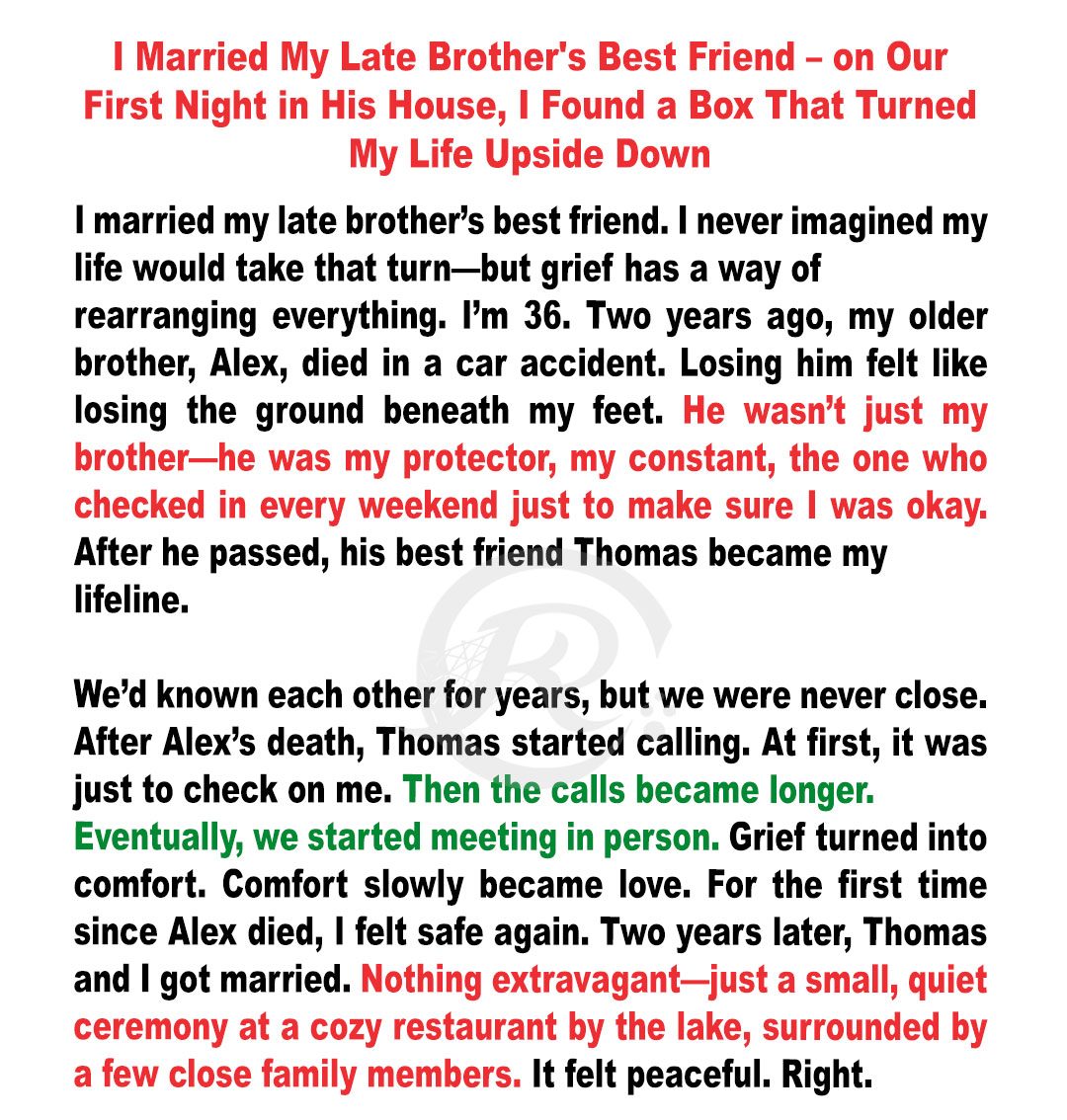 After my brother died, his best friend became my lifeline — and then my husband. I thought love had saved me from grief. Until our wedding night, when I found a box hidden in our bedroom. Inside was a letter from my brother that said, “My sister must never know the truth.”