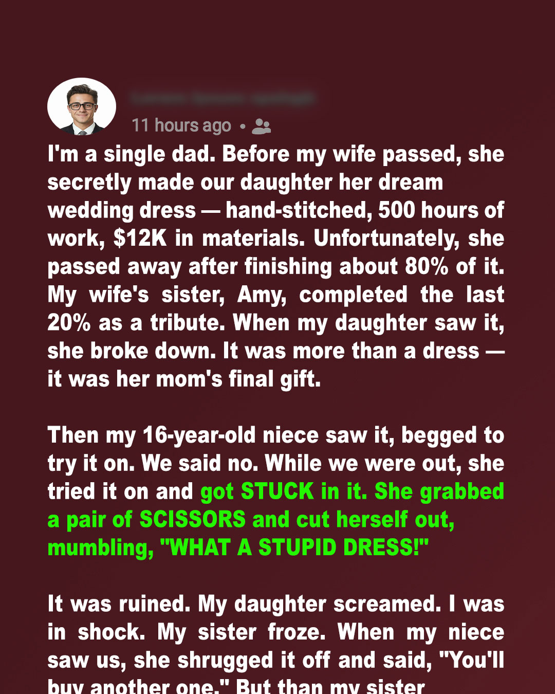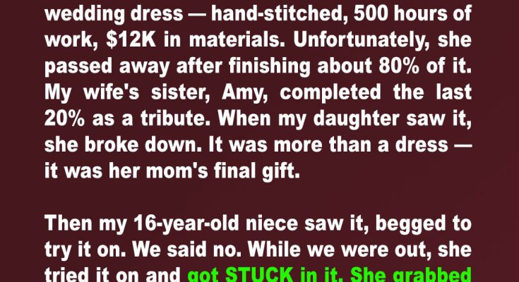 My late wife spent 500 hours hand-sewing the perfect wedding dress for our daughter. It cost $12,000 and was her final act of love before she passed away. Last week, my 16-year-old niece destroyed it in minutes. What happened next still gives me chills.