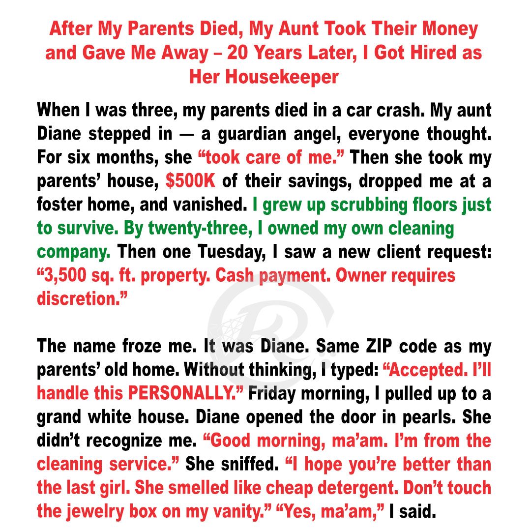 When Lena took a new high-paying cleaning job, she thought it was just another client on her growing company’s list until she saw the name. Twenty years after her aunt stole everything and abandoned her, fate had placed Lena back at her doorstep. Would she finally get justice?