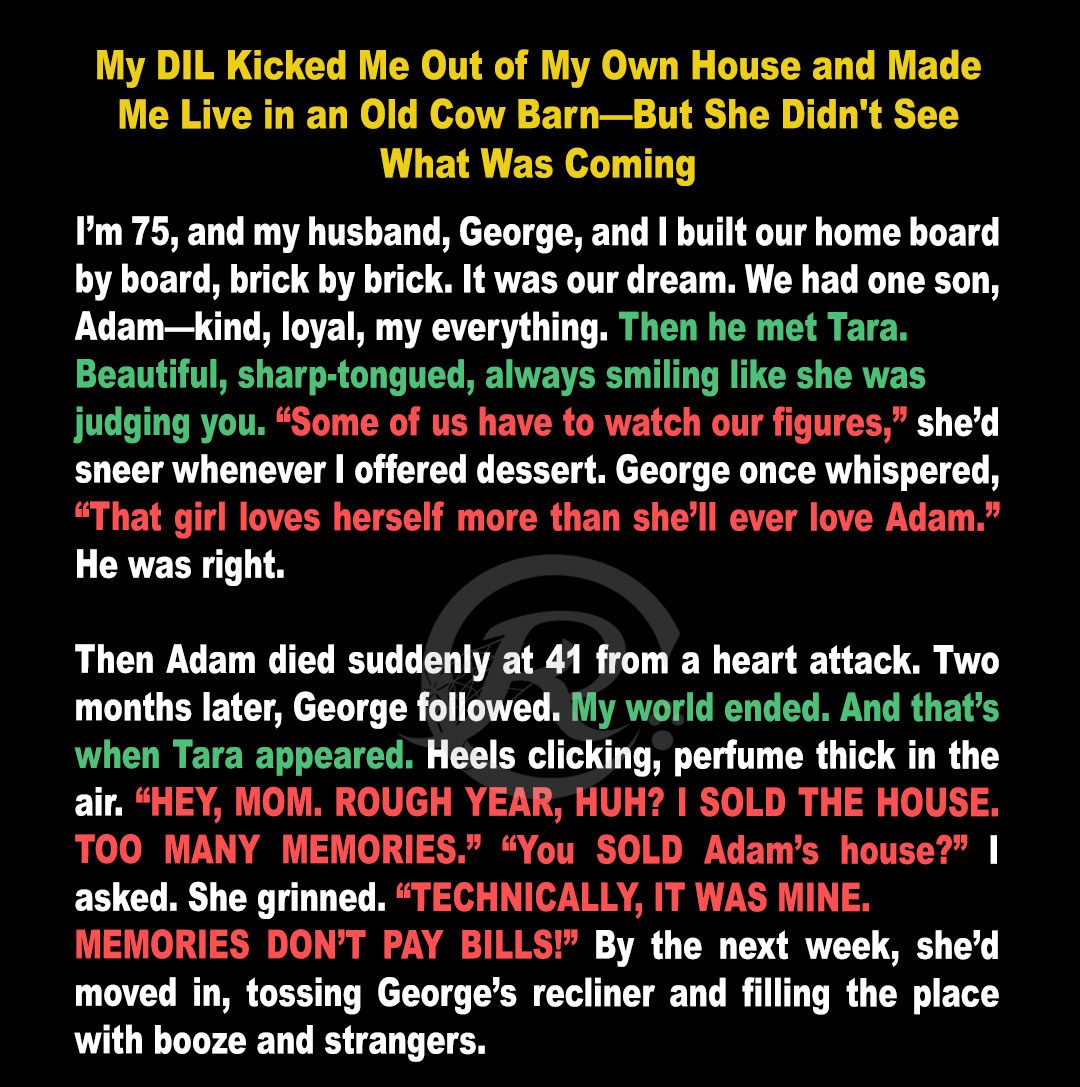 From that day on, I lived in the old cow barn behind the apple trees. It had no insulation, no heat, and the windows rattled with every gust of wind. George had used it as a workshop, so there were old nails, paint cans, and rusted tools scattered everywhere. I cleared out a corner and laid down the yoga mat, then placed a blanket over it. But it wasn’t enough.