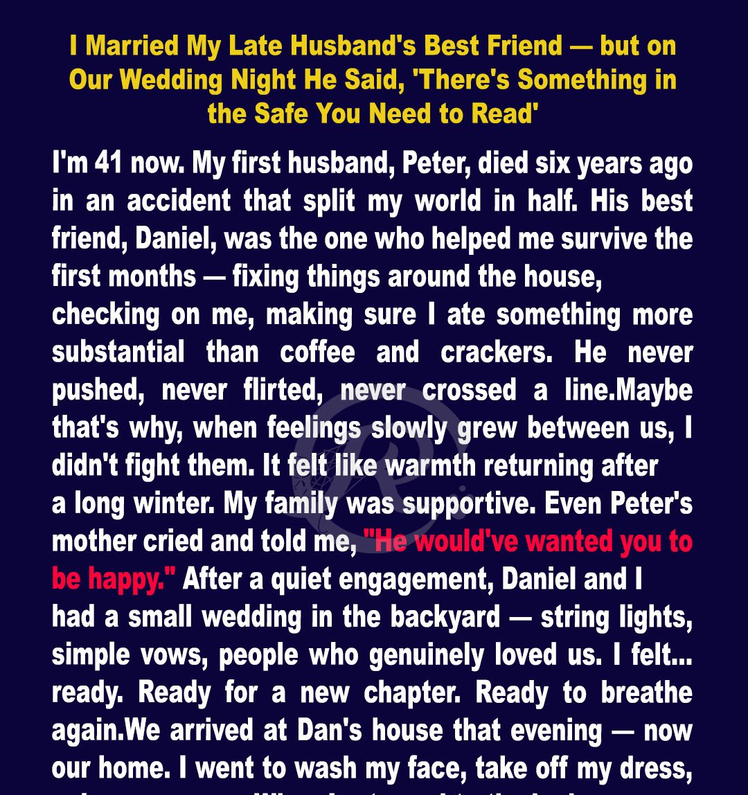 When my late husband’s best friend asked me to marry him, I thought I’d already faced the hardest parts of grief and said yes. But on our wedding night, standing in front of an old safe with trembling hands, my new husband said words that made me question everything I thought I knew about love, loyalty, and second chances.