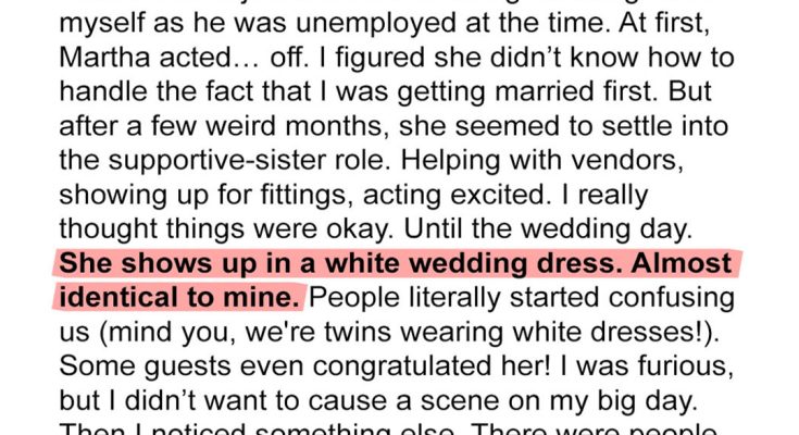 When I saw my twin sister, Tara, standing at my altar in her white gown, I thought it was some twisted joke. But what happened next made me realize the white dress was just the beginning of their plan.
