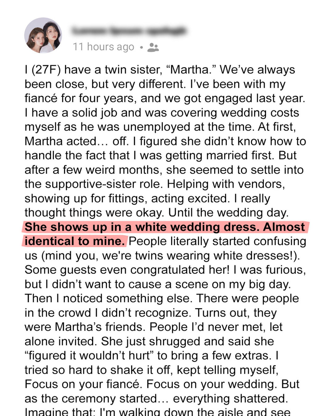 We’d always been close, but she started acting strange as soon as I announced the news. When I’d show her wedding magazines or talk about dress shopping, she’d get this weird look on her face.