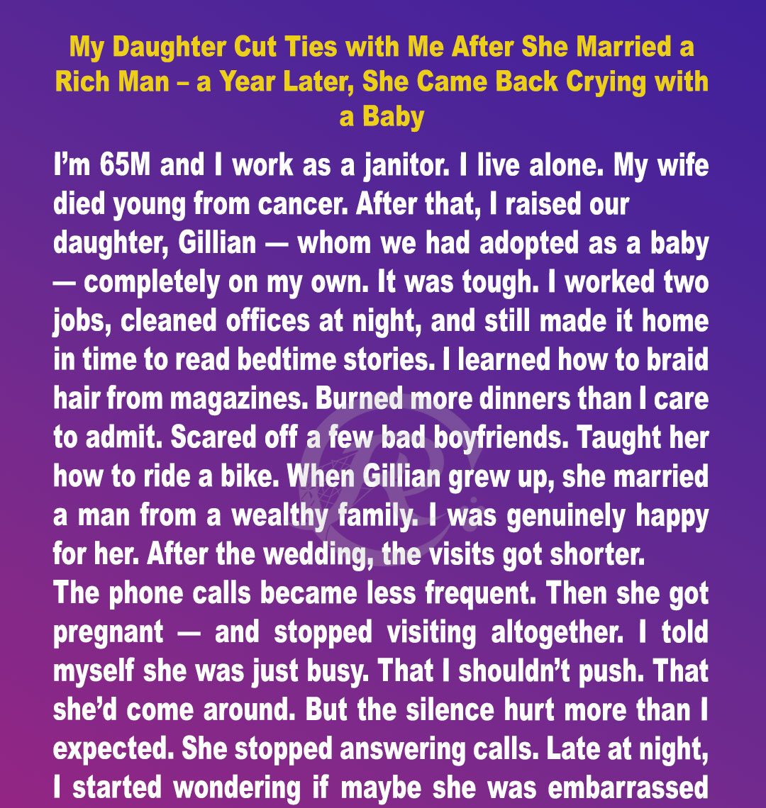 I’m a 65-year-old janitor who thought his daughter had quietly outgrown him. Nearly a year after telling me she was pregnant, she turned up at my door in tears, holding a baby carrier.