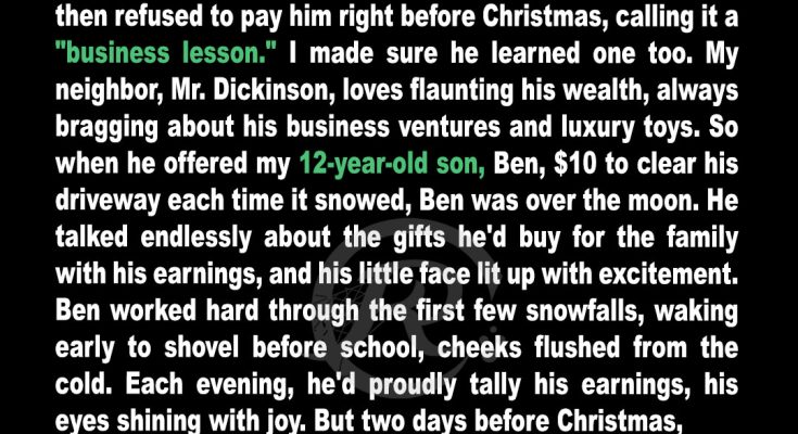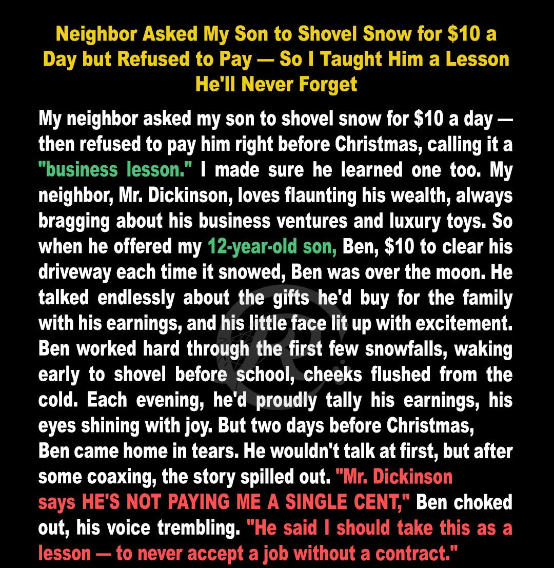 When my 12-year-old son Ben took up our wealthy neighbor’s offer to shovel snow for $10 a day, he couldn’t wait to buy gifts for the family. But when that man refused to pay, calling it a “lesson about contracts,” Ben was heartbroken. That’s when I decided to teach him a lesson he’d never forget.
