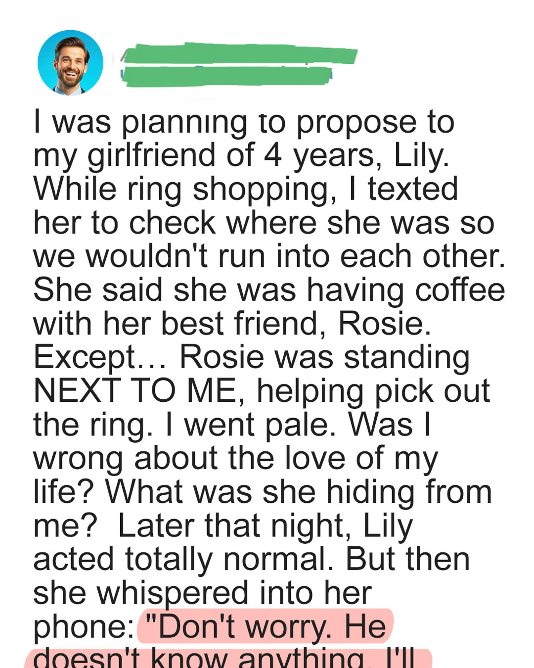 When your girlfriend texts about coffee with her best friend while that same friend stands beside you picking out diamond rings, your world stops. I thought I knew everything about Lily after four years together, but I was wrong.
