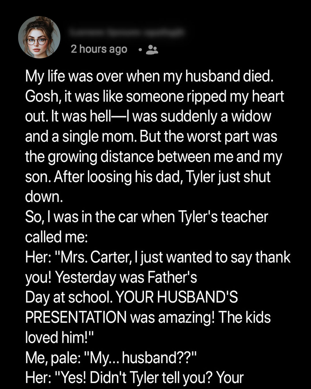 When my son casually mentioned his school’s Father’s Day event, I smiled through the ache—his dad’s been gone three years. But nothing prepared me for the teacher’s call the next day, thanking me for my husband’s “amazing presentation.” I froze. What was she talking about?